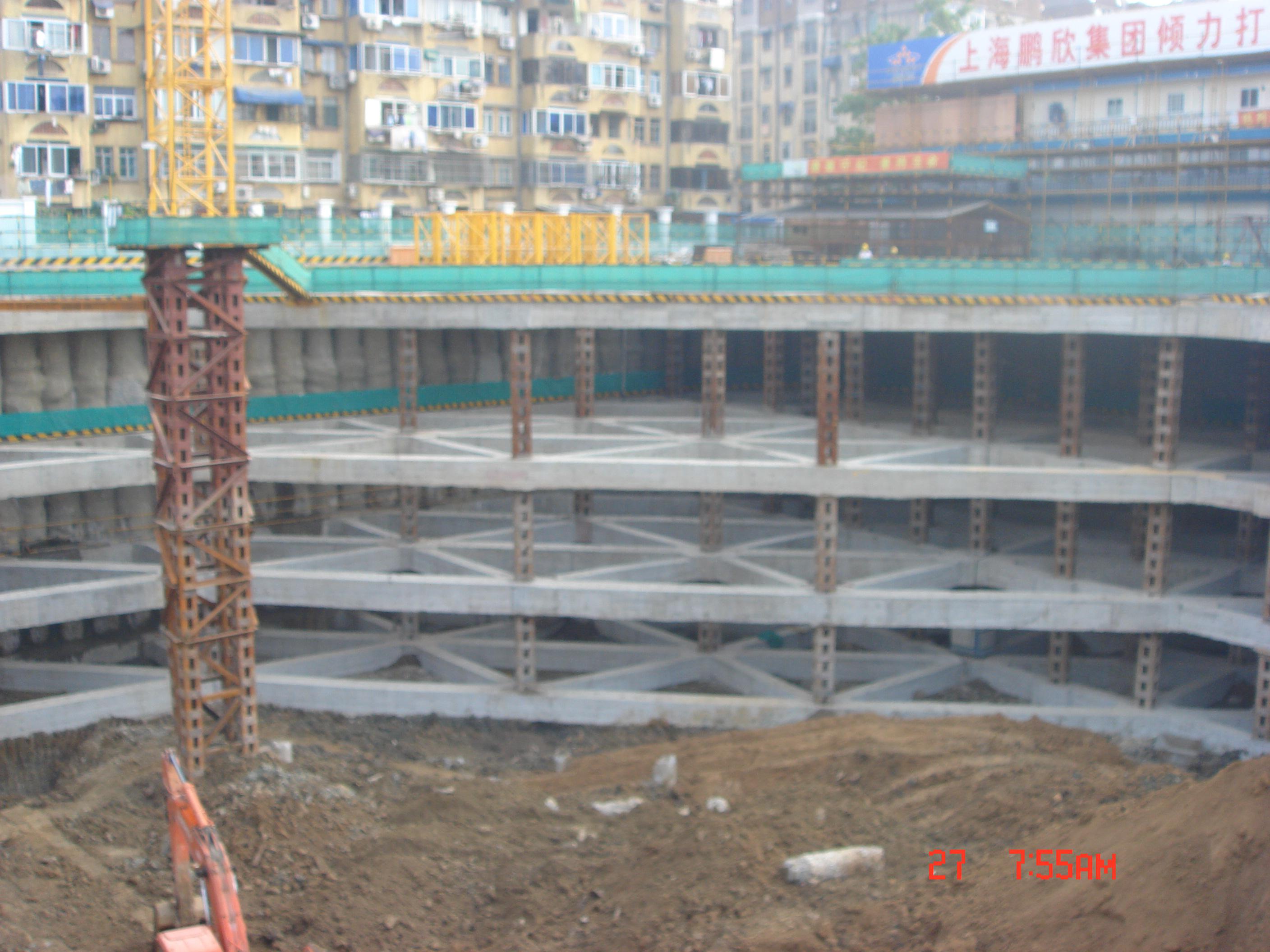 項目位于建康路和中華路交界處東北角,南京外運大廈南側。工程主樓為3幢15~16層,裙樓4~5層,整體設有4層地下室,基坑南北長170m,東西寬140m,基坑圍長608m,開挖深度20m。采用鉆孔灌注樁+4層砼支撐的支護形式,坑外施工三軸深層攪拌樁作為止水帷,基坑支護結構的安全等級為"一級"。南京市優秀工程測繪一等獎,江蘇省城鄉建設系統優秀勘察設計二等獎,江蘇省第十二屆優秀工程勘察二等獎。