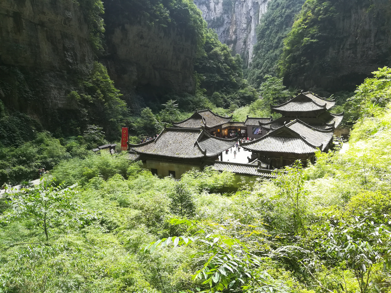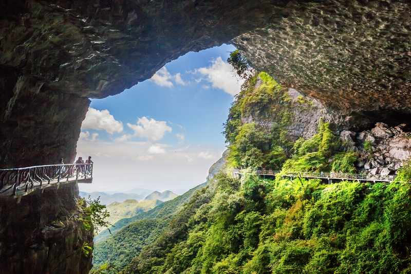 沿著山道,繼續前行,來到懸崖上的懸空棧道上。這里真可怕,只要向下看一眼,心就“怦怦”地跳個不停。為什么說它可怕呢?因為這些步行梯全建在近百米高的懸崖半山腰上,上下都無著落點,我真的很難想像工人們是如何建成的這些供人們行走的臺階。我們快速的跑過這里,來到了一個幽深的黑洞里,讓我們不禁感嘆大自然的鬼斧神工。這兒真涼快,不冷不熱,溫度剛剛好。于是大家停了下來,稍作休息后,繼續往前走。